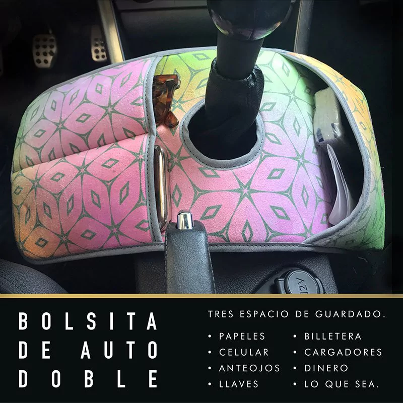 ¡Dale un toque diferente a tu auto! Esta bolsa para auto doble no solo es muy canchera sino también práctica y funcional. Posee tres espacios de guardado que te permiten depositar el celular, anteojos, llaves, billetera, cargadores y todo lo que te puedas imaginar. Está confeccionada en tela simil neopren.