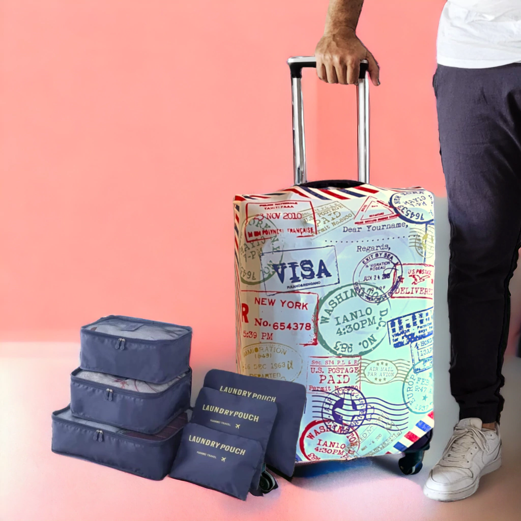 Arrancá canchereando tu valija con esta funda confeccionada en tela de microfibra con lycra + nuestro increíble Kit Organizador de Valijas de 6 estuches.