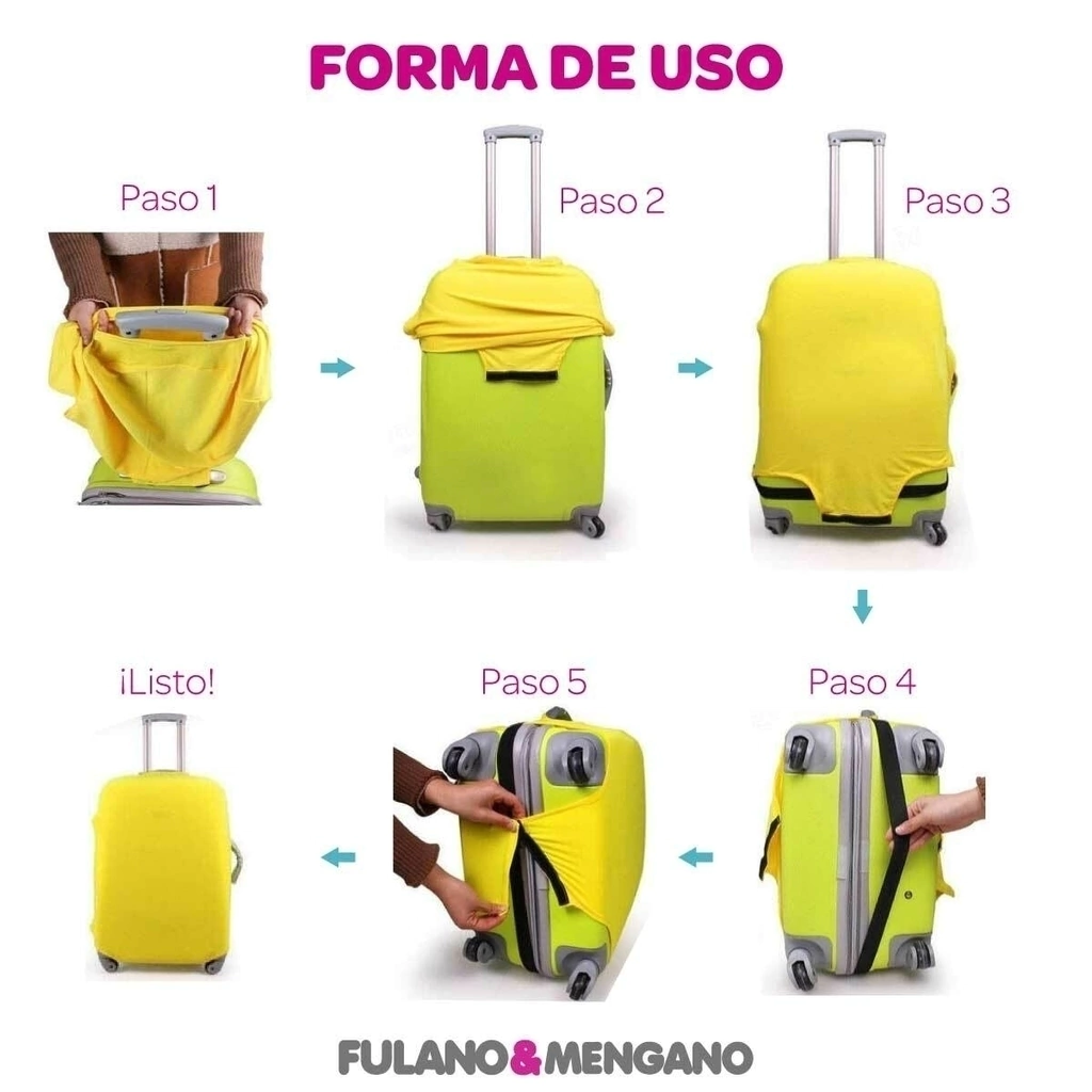 La funda para valija en tela de microfibra con lycra ayuda a proteger toda la estructura de tu maleta para prevenir rayones, manchas y aberturas. Tiene dos aberturas (arriba y a un costado) para las manijas, y se ajusta por debajo con un elástico y un velcro!