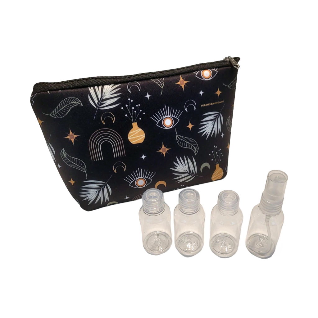 Contiene un neceser hecho en símil neopreno con cierre, 3 botellitas de tapa ciega y un atomizador.